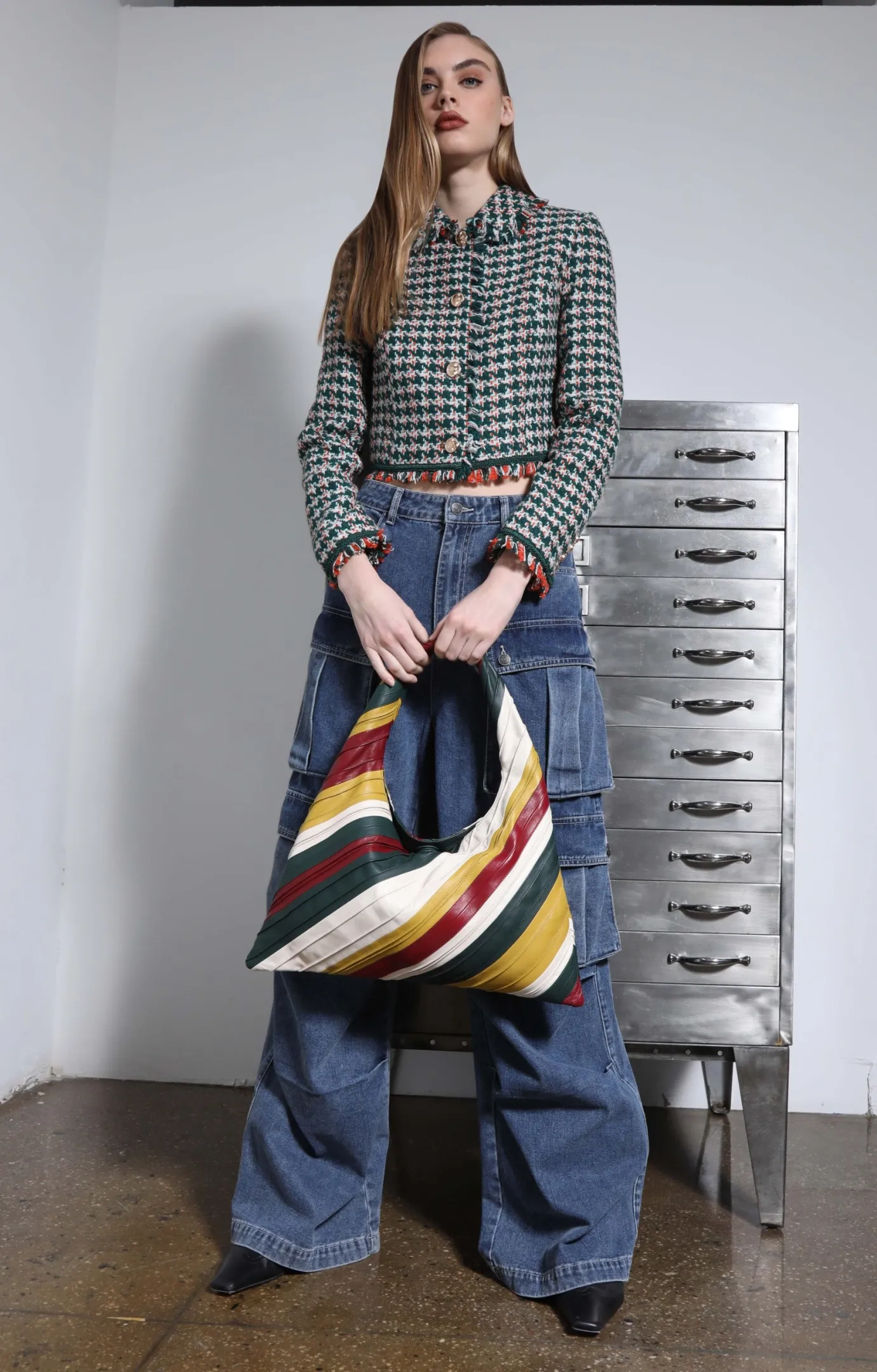A collar button down tweed jacket in an eye catching color, and with self trim detail, is the Alfie Jacket. This crop style makes a statement on its own, and even more so with the matching Ansley Skirt
