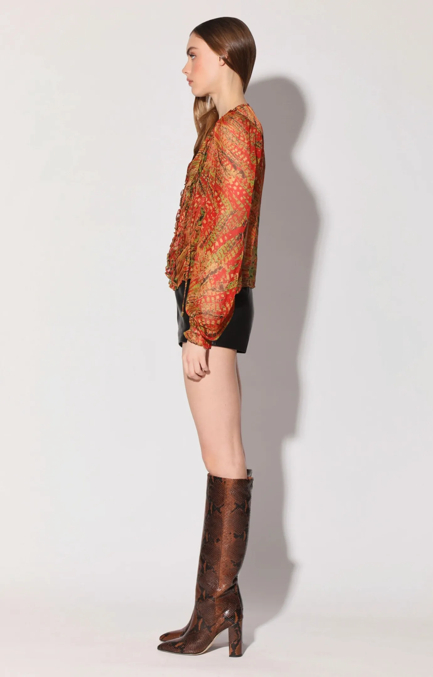 In a beautiful print and effortless shape, the Andy Top is great for any occasion. With neck tie detail and mini ruffle accents, youi can wear over a bralette, or nothing at all