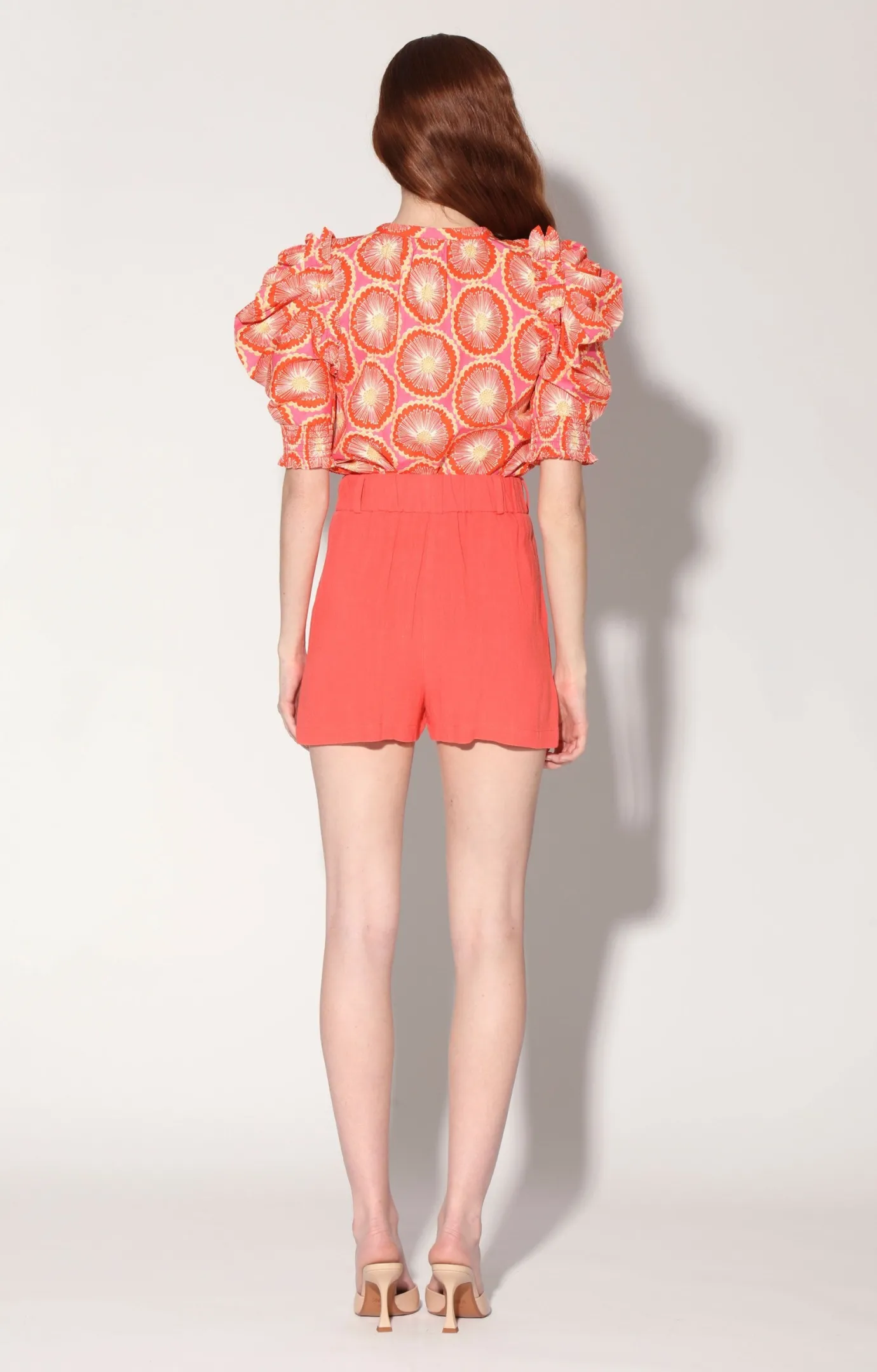 Fun and stylish, the Colleene Top showcases statement sleeve with ruffle detail in a bold print. Wear it with our linen shorts or back to the Christie Skirt for a playful 2 piece look!
