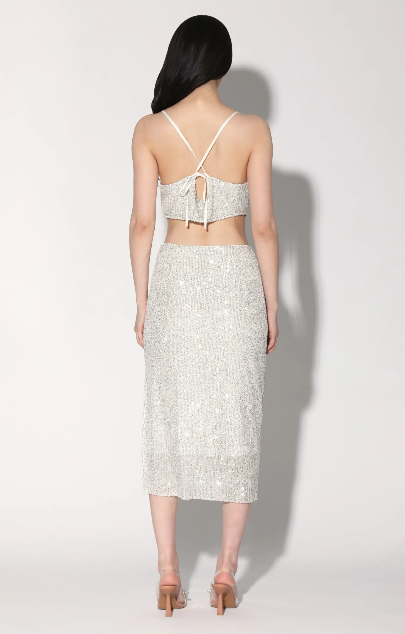 For instant glamour, complete your look with the Crista Skirt. This midi skirt sits on the hips showcases a sensual side slit