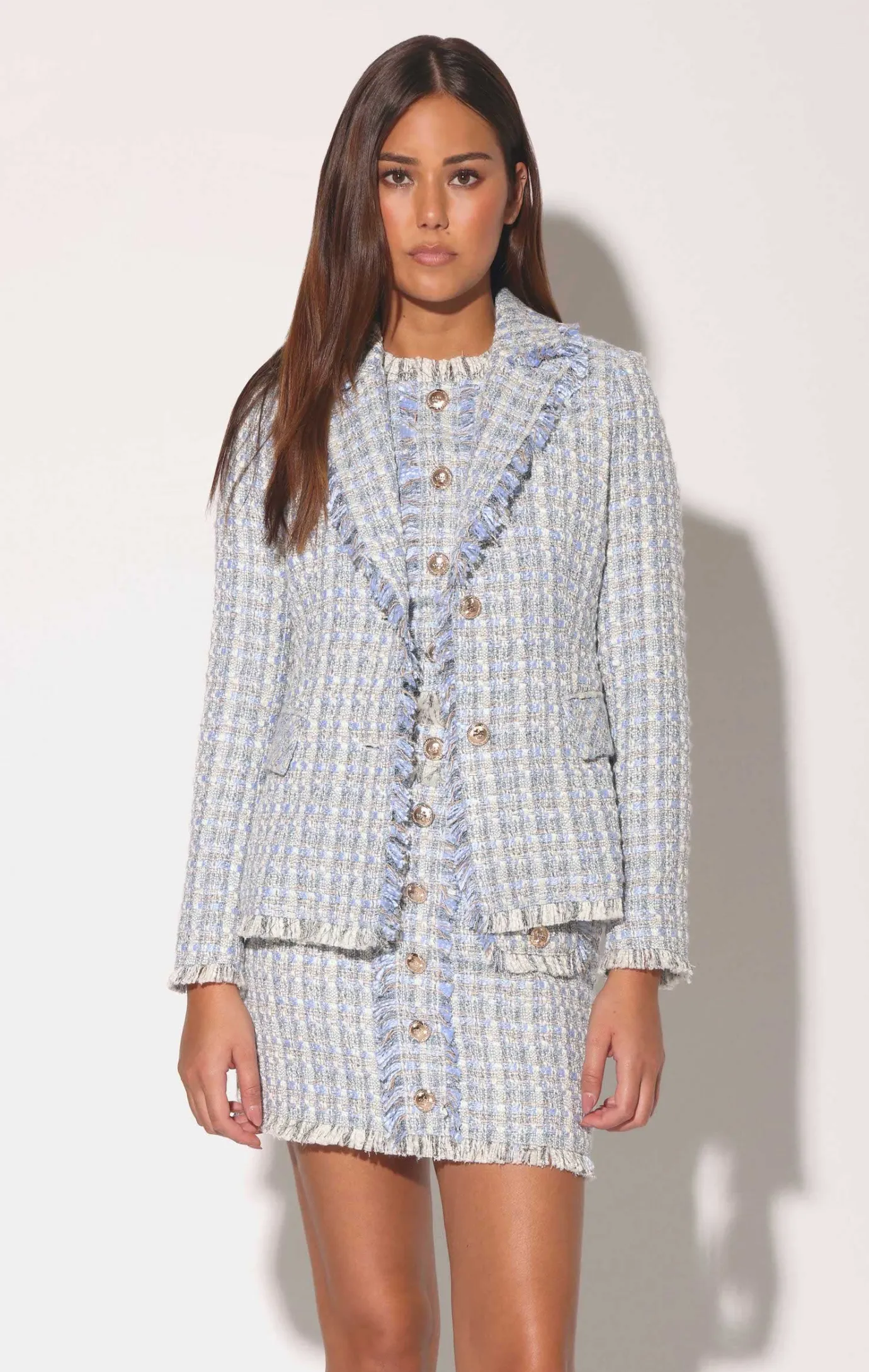 The Damon Blazer is an easy fit longline jacket in our stylish tweed fabric with fringe trim. Wear it with the Dalia Skirt for a fabulous set