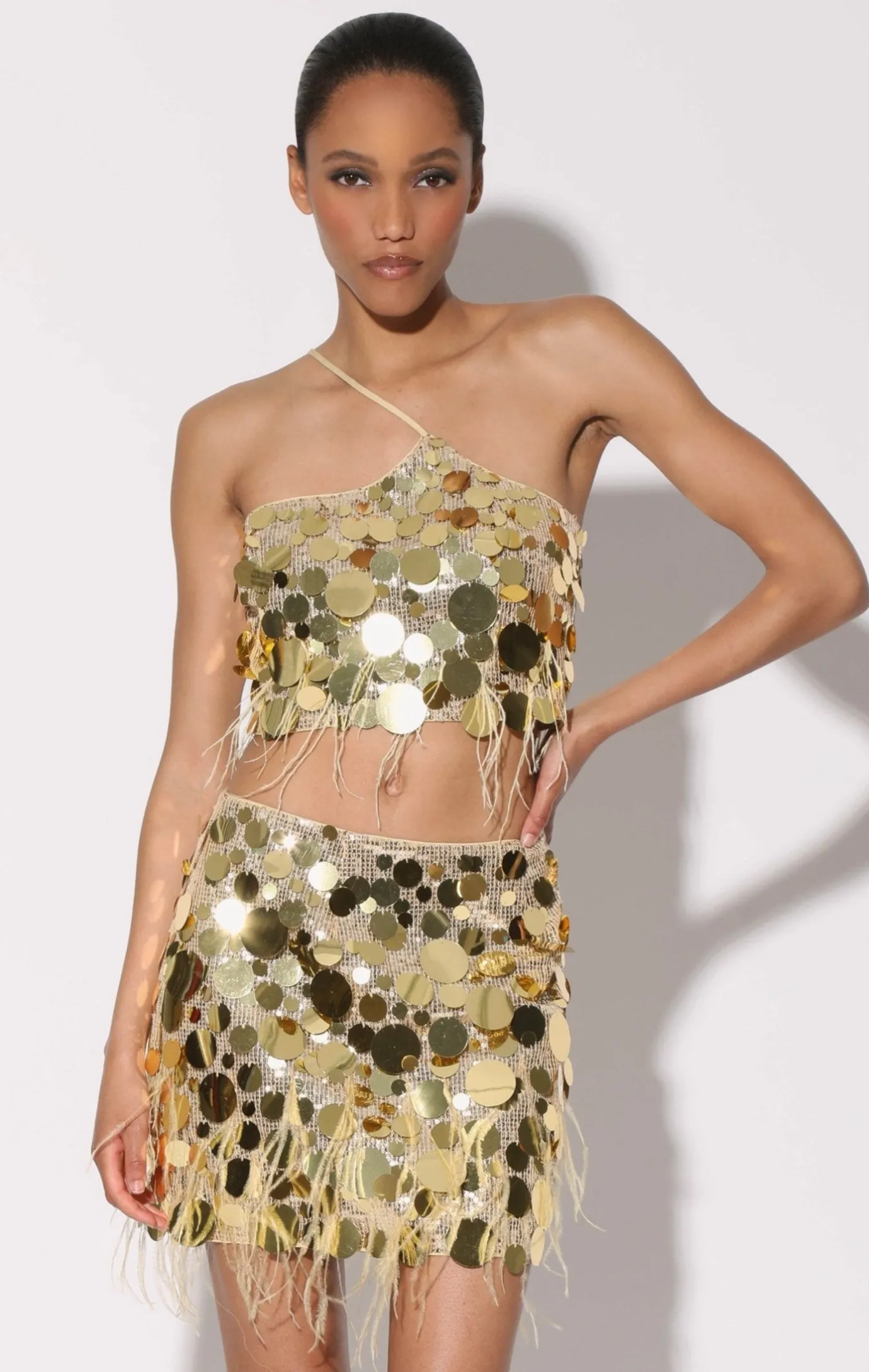 The Darcy Skirt showcases our elegant sequin fabric for a fresh mini style. Pair it with the Arabelle Top for an eye catching set look