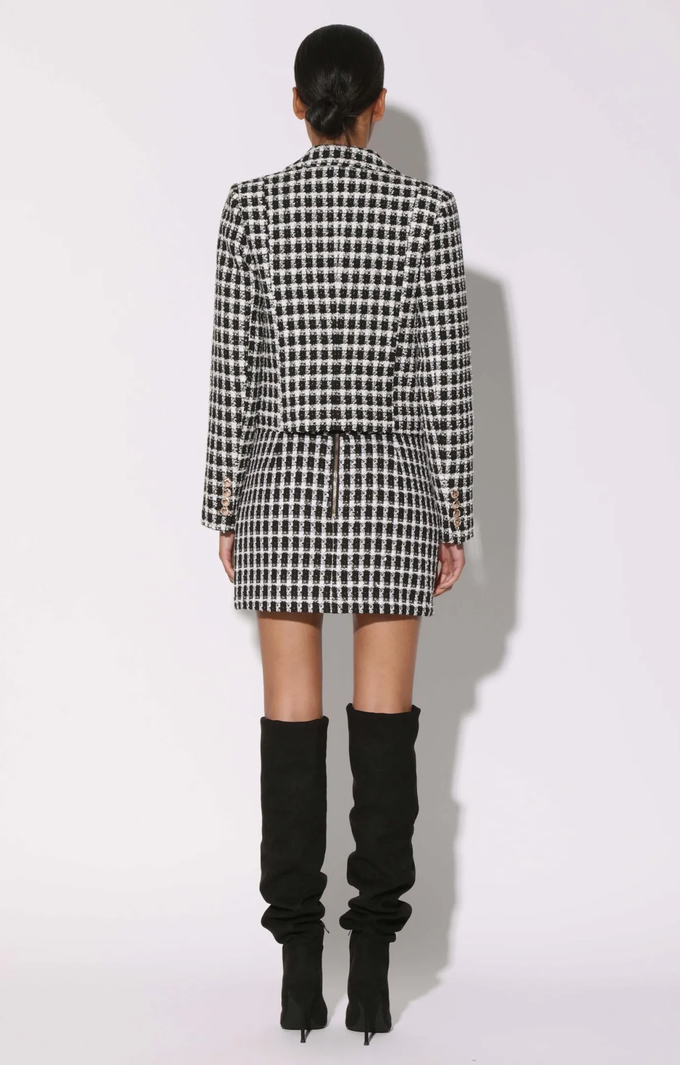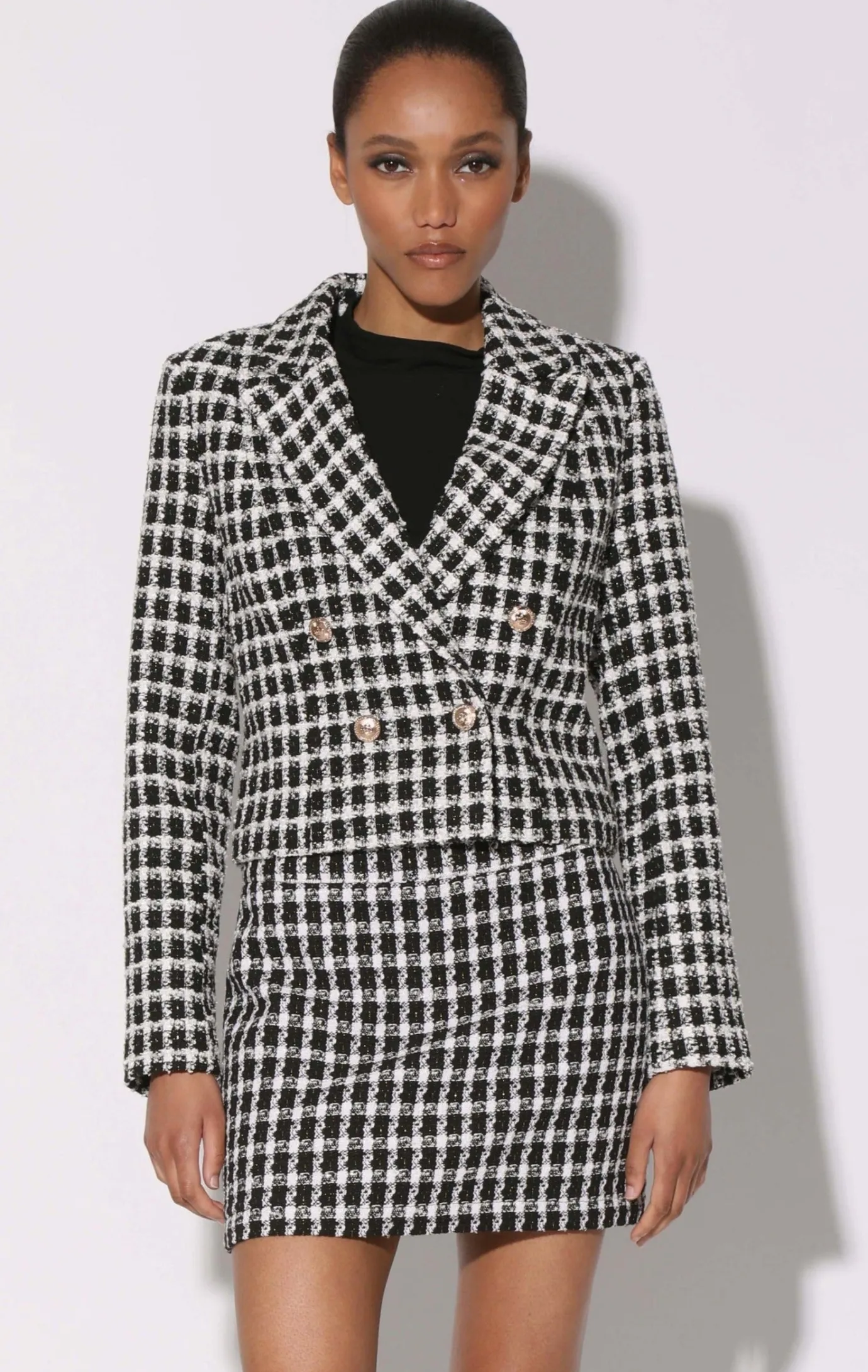 The Devlyn Blazer is a short double breasted blazer with a peak lapel and gold button accents. Pair it with the Daria Skirt for a chic tweed look