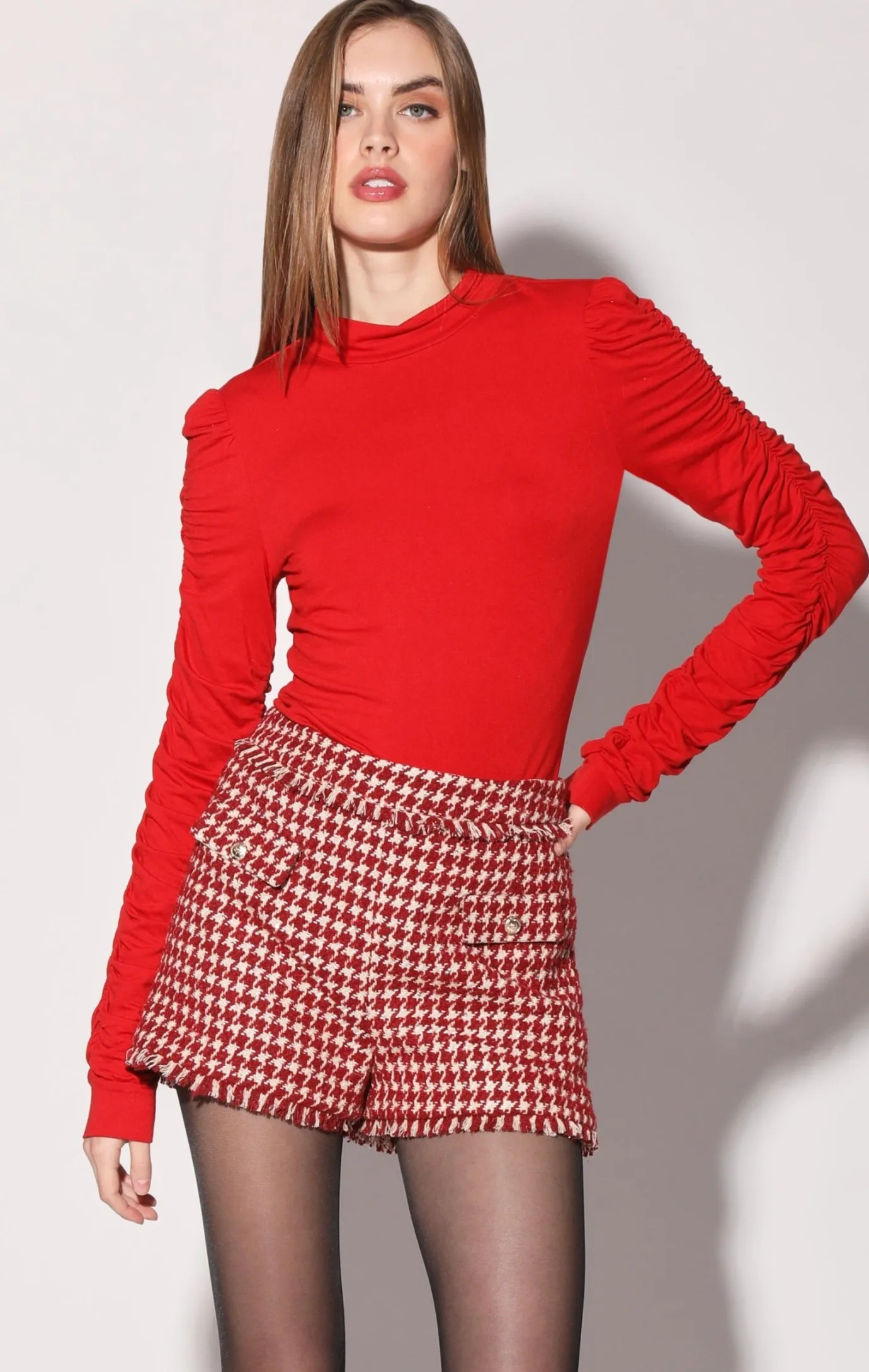 With a flattering high waist shape in our luxe tweed fabric The Dora Short features pocket flaps with engraved buttons and fringe accents. Wear it with the Lyona Jacket to make a statement