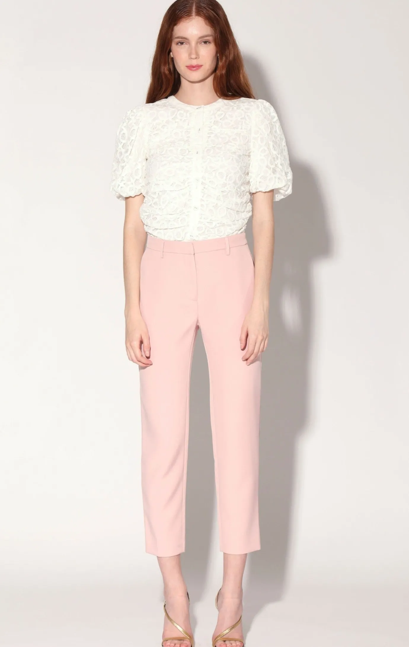 Crew neck; Button down closure; Fitted shape; Side, center back and front placket shirring detail; Short balloon sleeves; Fully lined