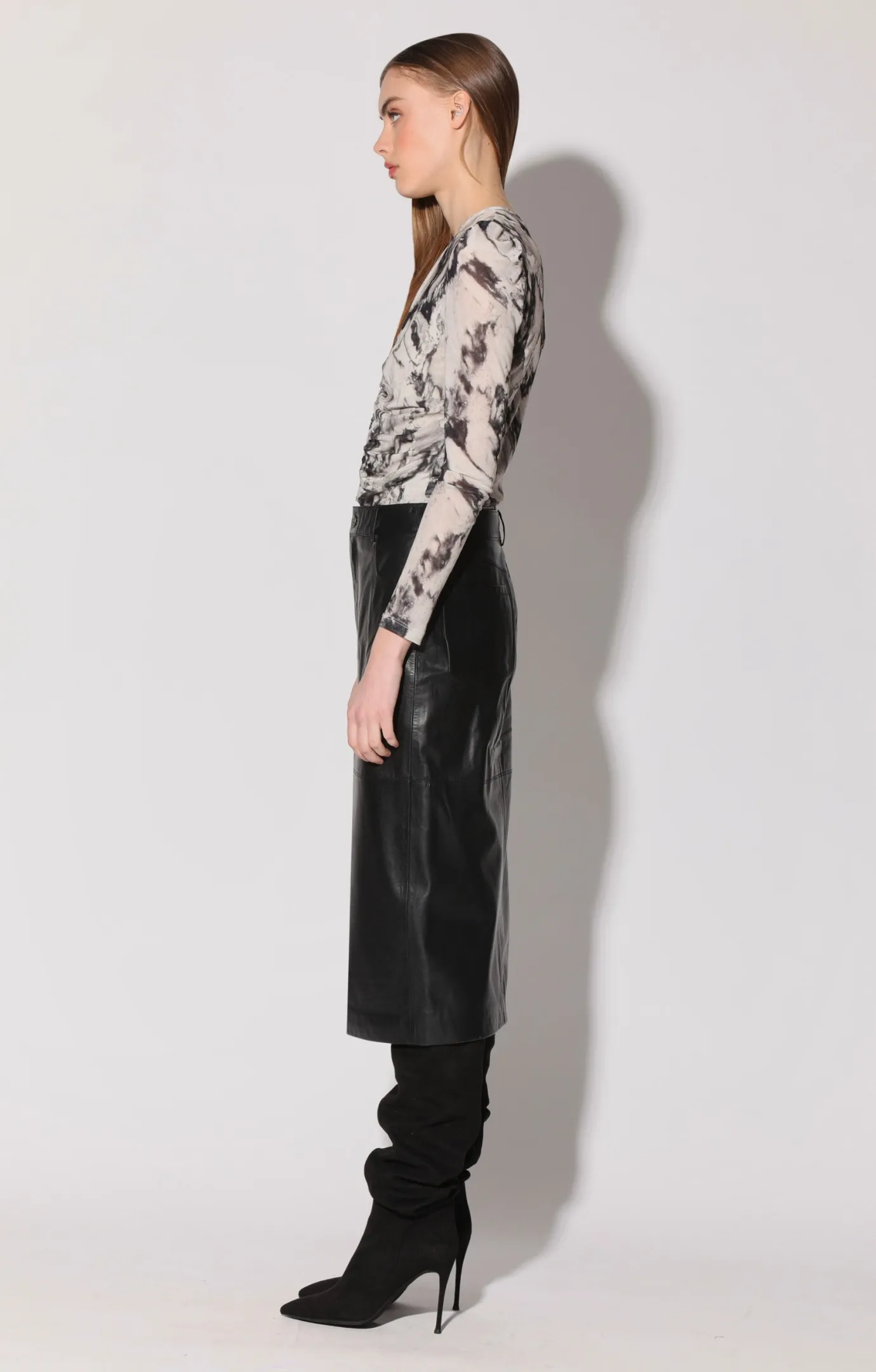 With sassy shirring accents, the Justine Top is a flattering top for every occasion. In an edgy printed mesh, you’ll want to wear it with our slouchy pant and fitted skirts