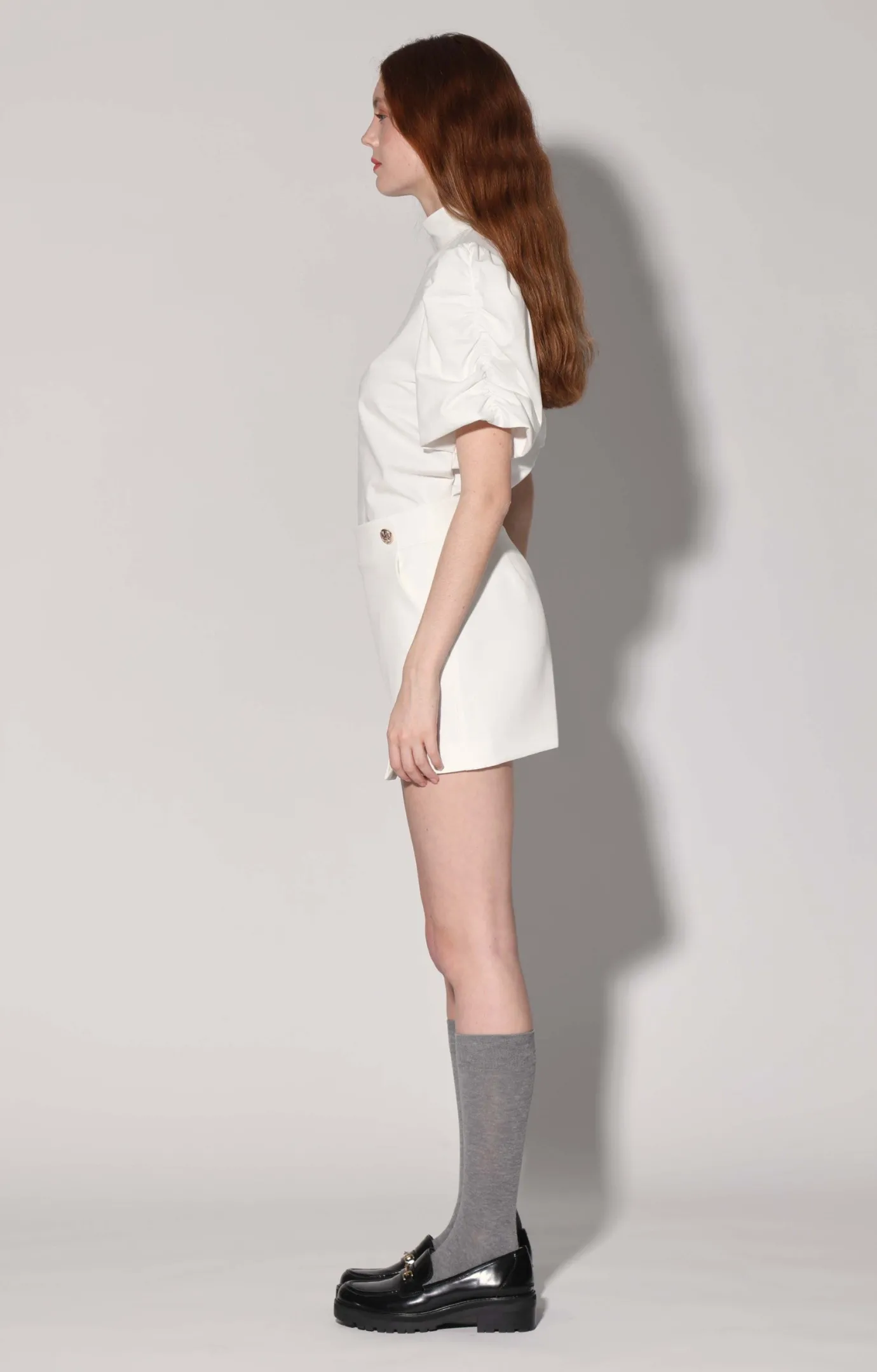 Hidden center back zipper; Fitted waistband; Non functional front waist button detail; Slant pockets; Full lining