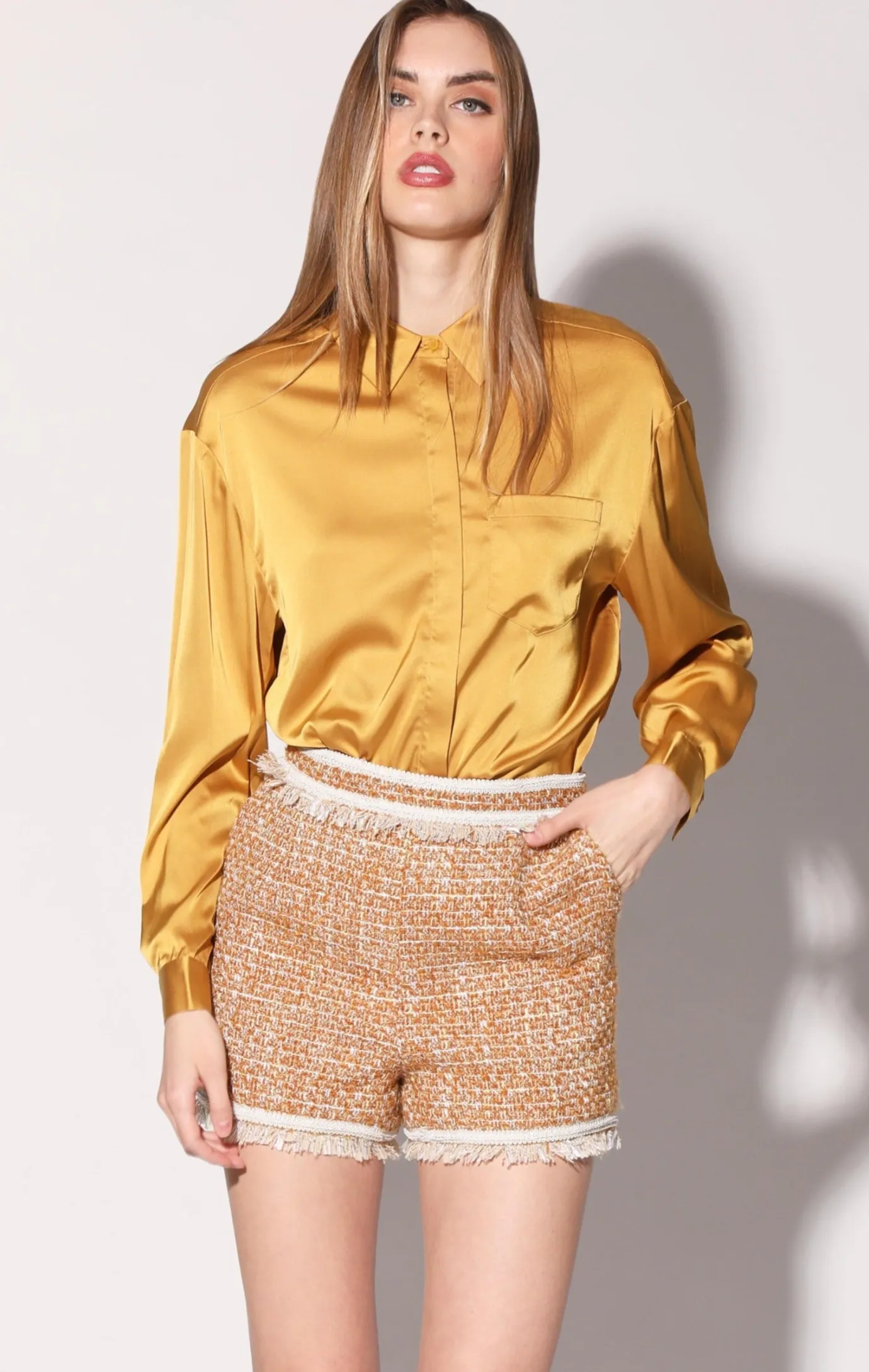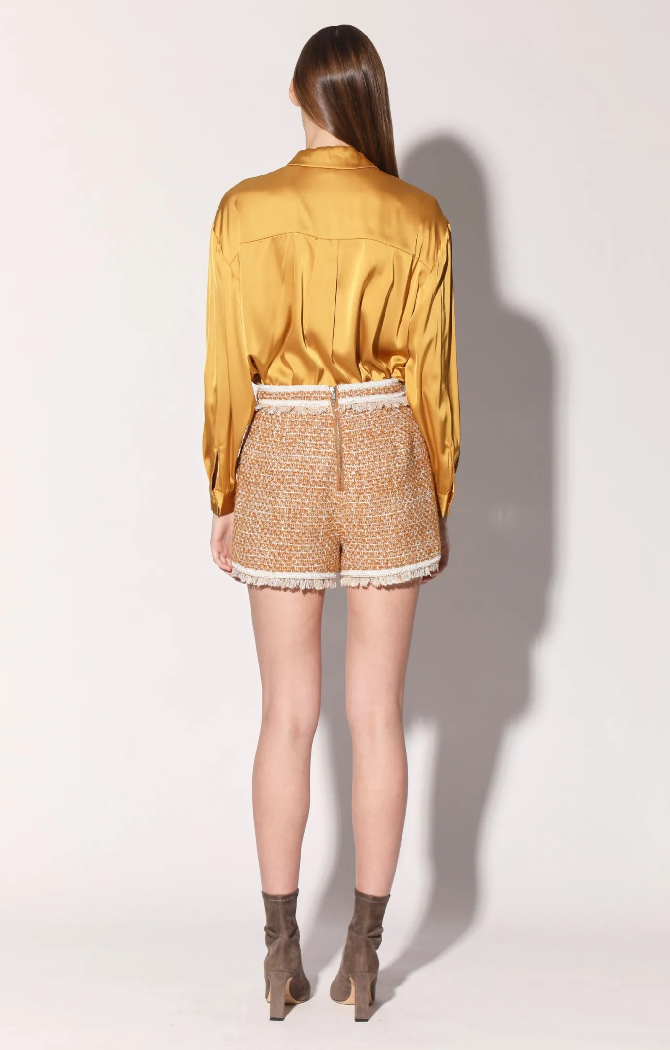 The Laken short is a playful update to tweed style. With ribbon accents and self fringe trim, it looks even more alluring worn as a set with the Leondra Jacket
