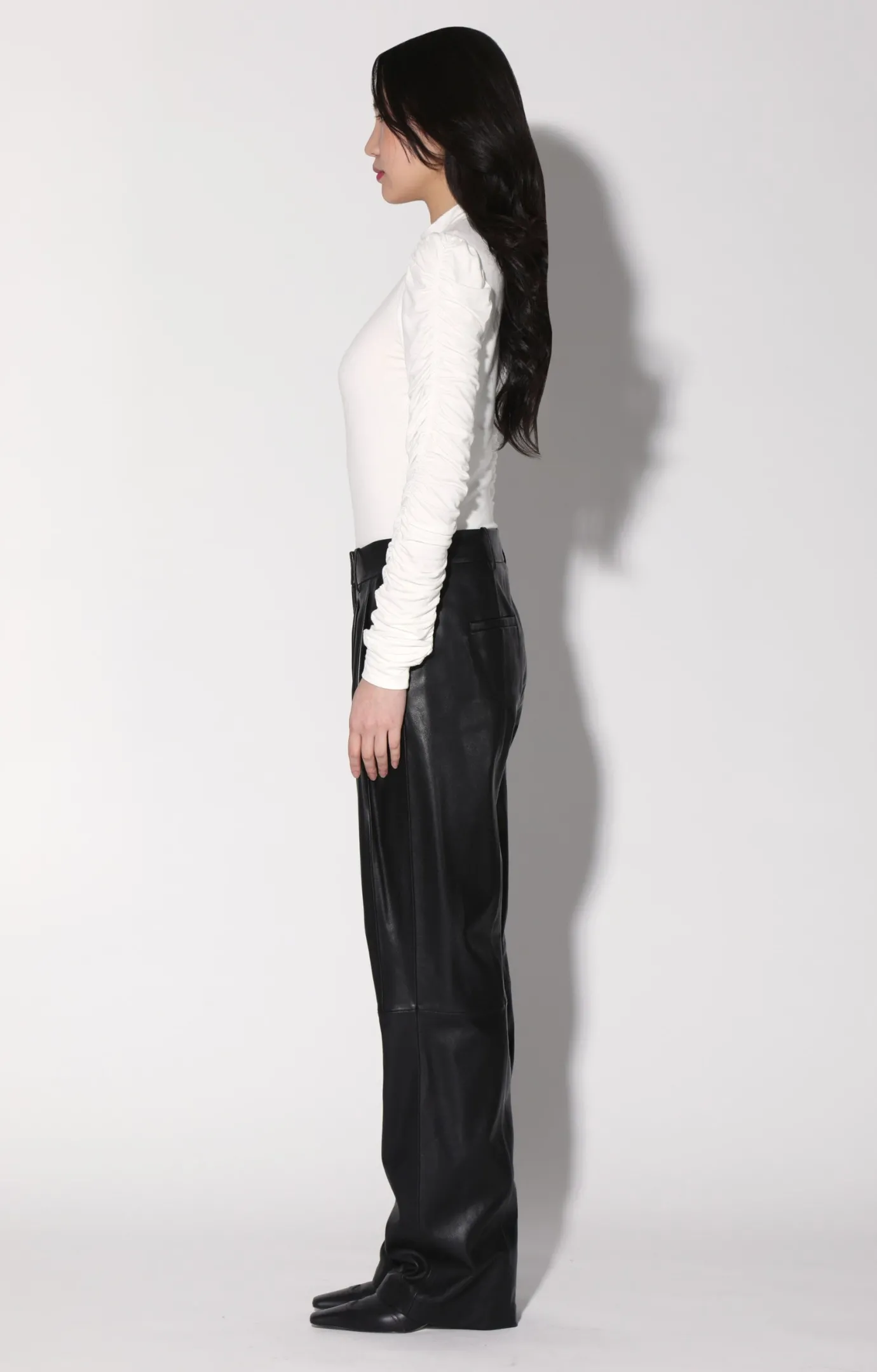 The Luka Pant is a leather meets suiting must have. It features a slouchy low waist fit, pleat details, and wide legs