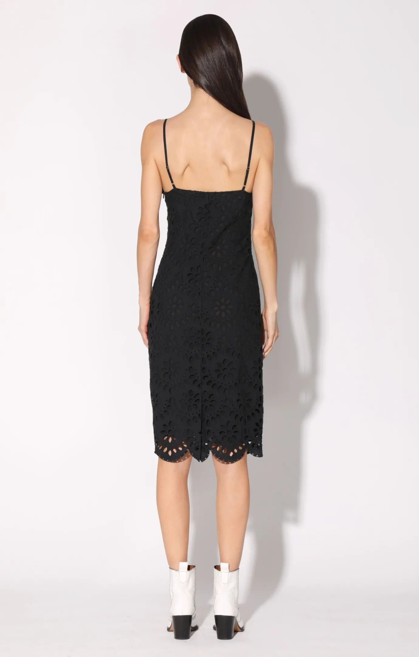 Make an entrance in the Madena Dress! This fitted midi with U trim neckline detail, in our beautiful eyelet fabric, is date night perfection