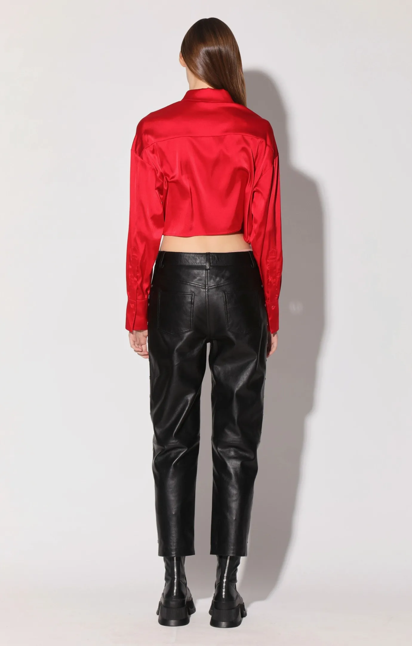 Featuring a crop length, and drop shoulder, the Montana Top is a sassy satin update to the classic button down.