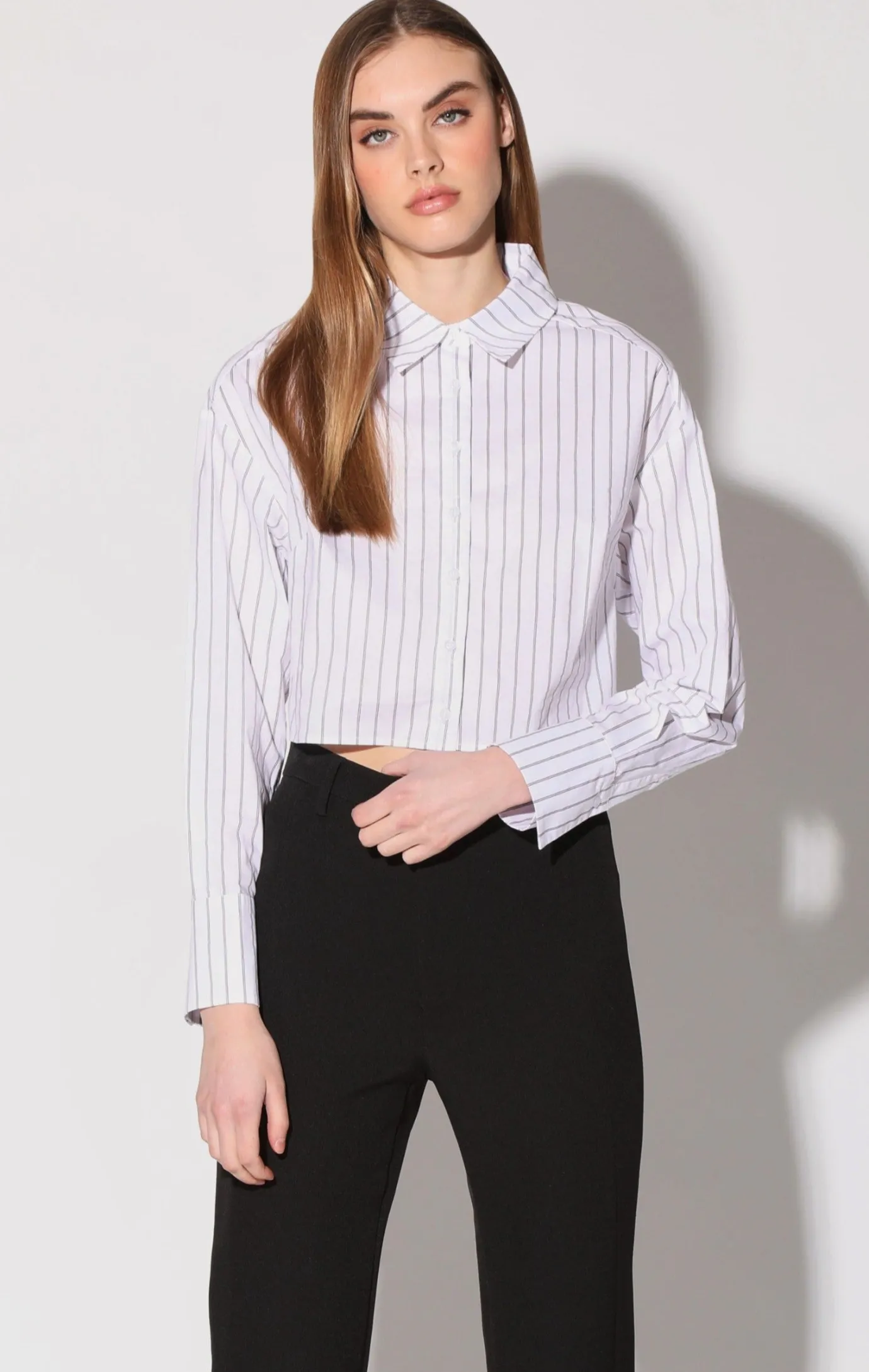 Coming in solid and stripes, The Montana Top in cotton is an update to the classic button down. With its crop length, drop shoulder, and long cuffs it’s great on its own or can be a great piece to layer