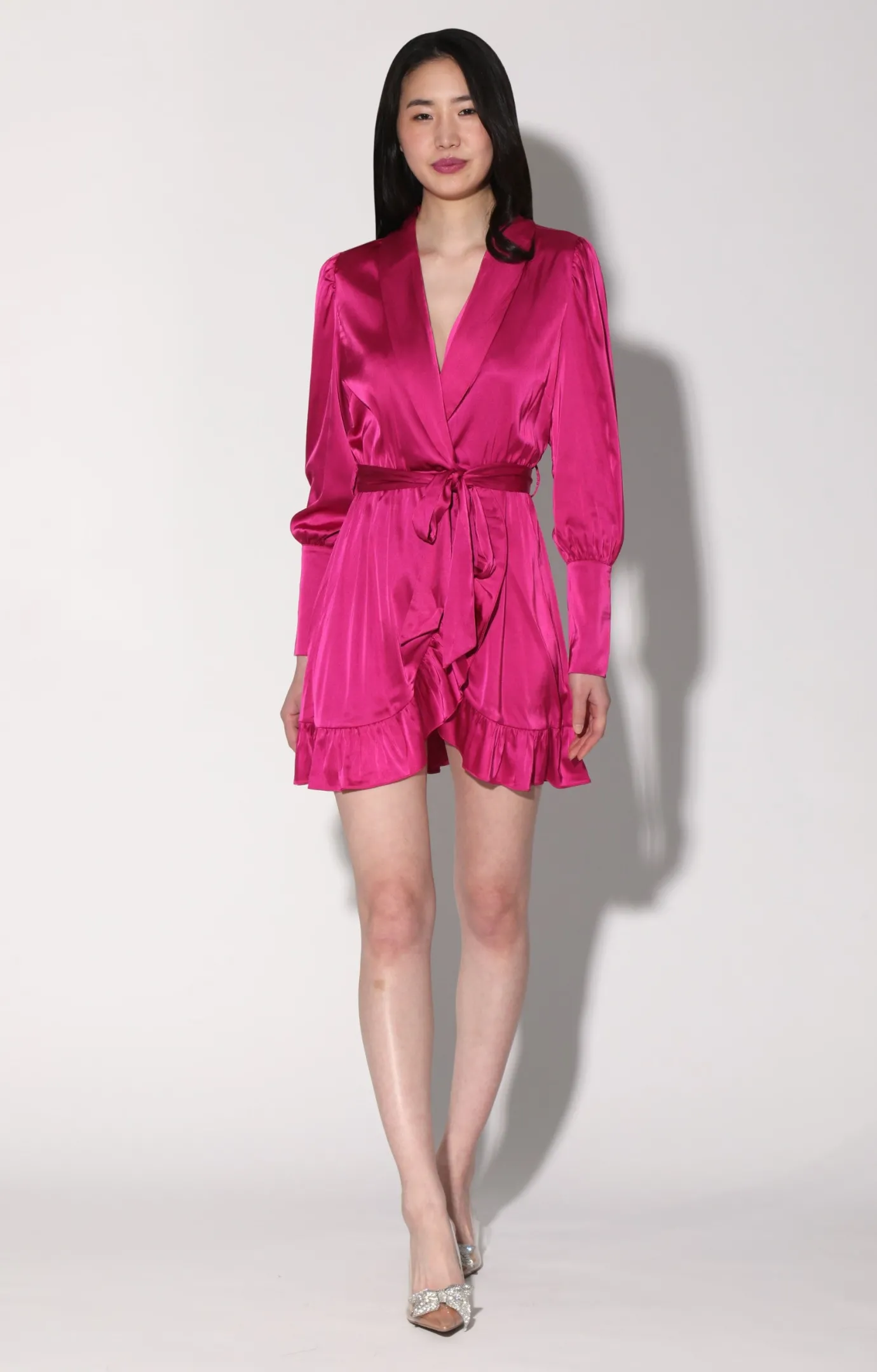 Feminine and effortless, the Maya Dress is a mini that showcases a surplice shawl collar, belted waist, and overlap skirt with ruffle accent