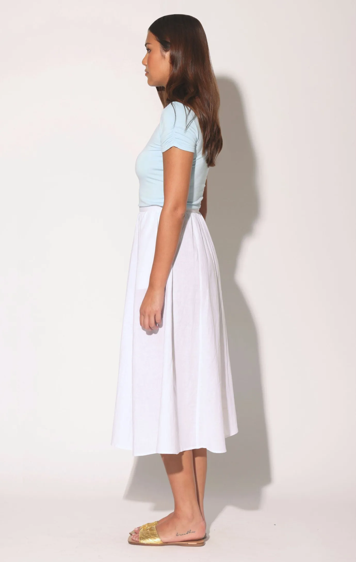 Etheral and easy, the Sharon Skirt is a must have for the season. This shirred midi length style bring a light feminine energy and goes with everything