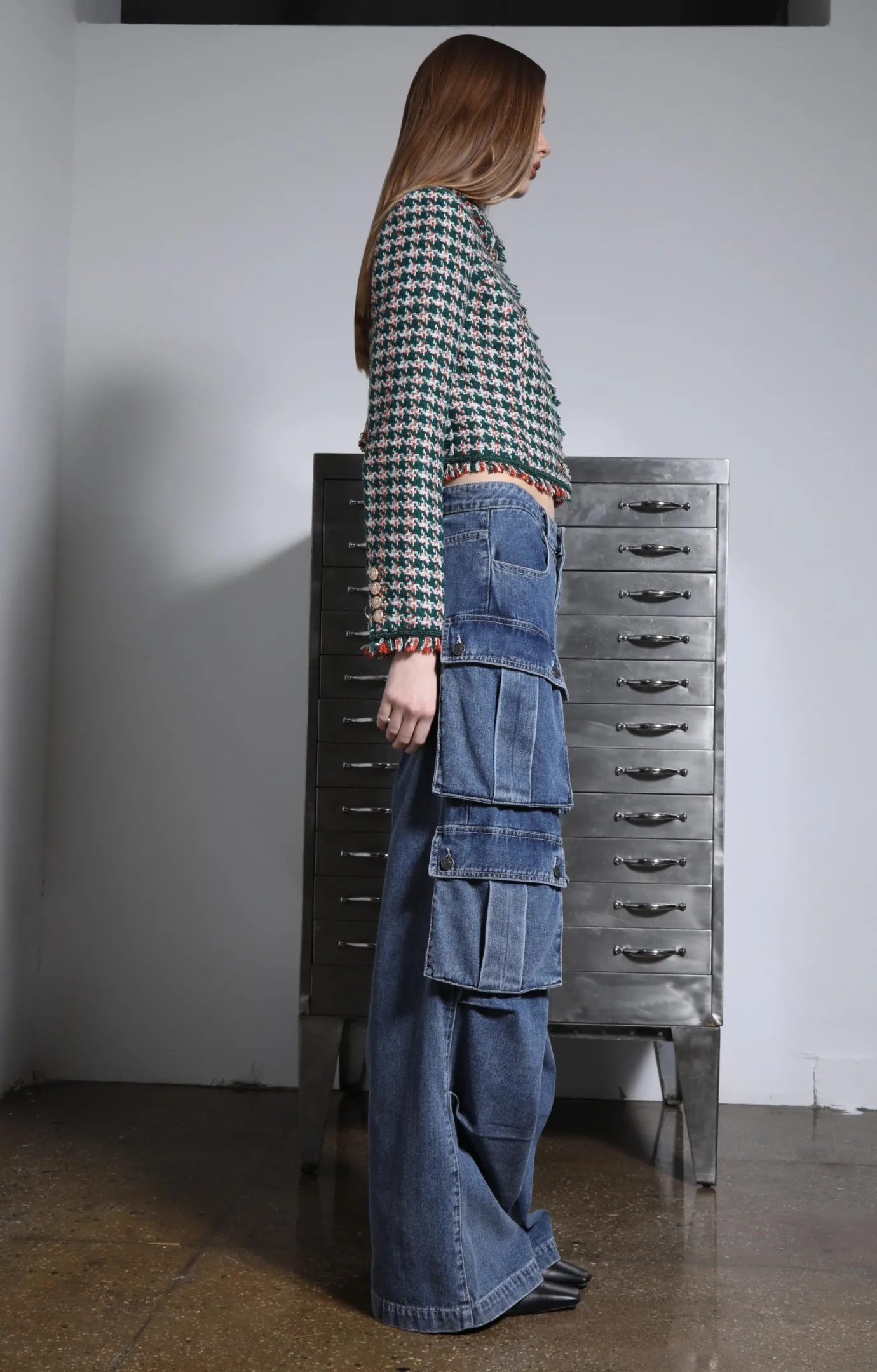A collar button down tweed jacket in an eye catching color, and with self trim detail, is the Alfie Jacket. This crop style makes a statement on its own, and even more so with the matching Ansley Skirt
