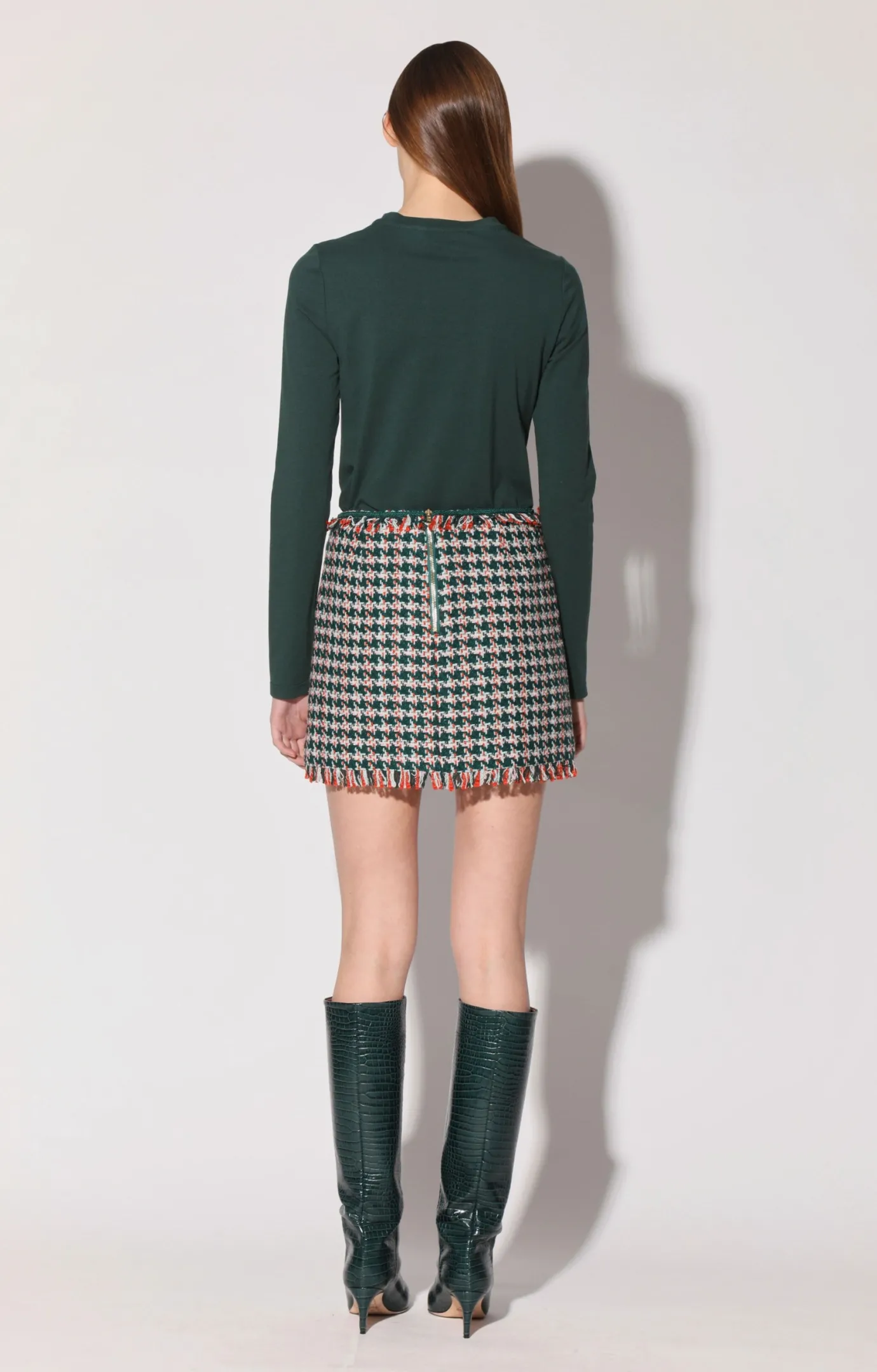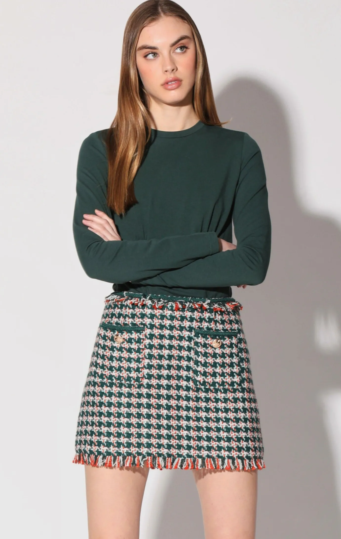The Ansley Skirt is a tweed skirt with all the bells and whistles. This mini skirti features front patch pockets, engraved button, self fringe, and ribbon trim details to go along with its matching Alfie Jacket