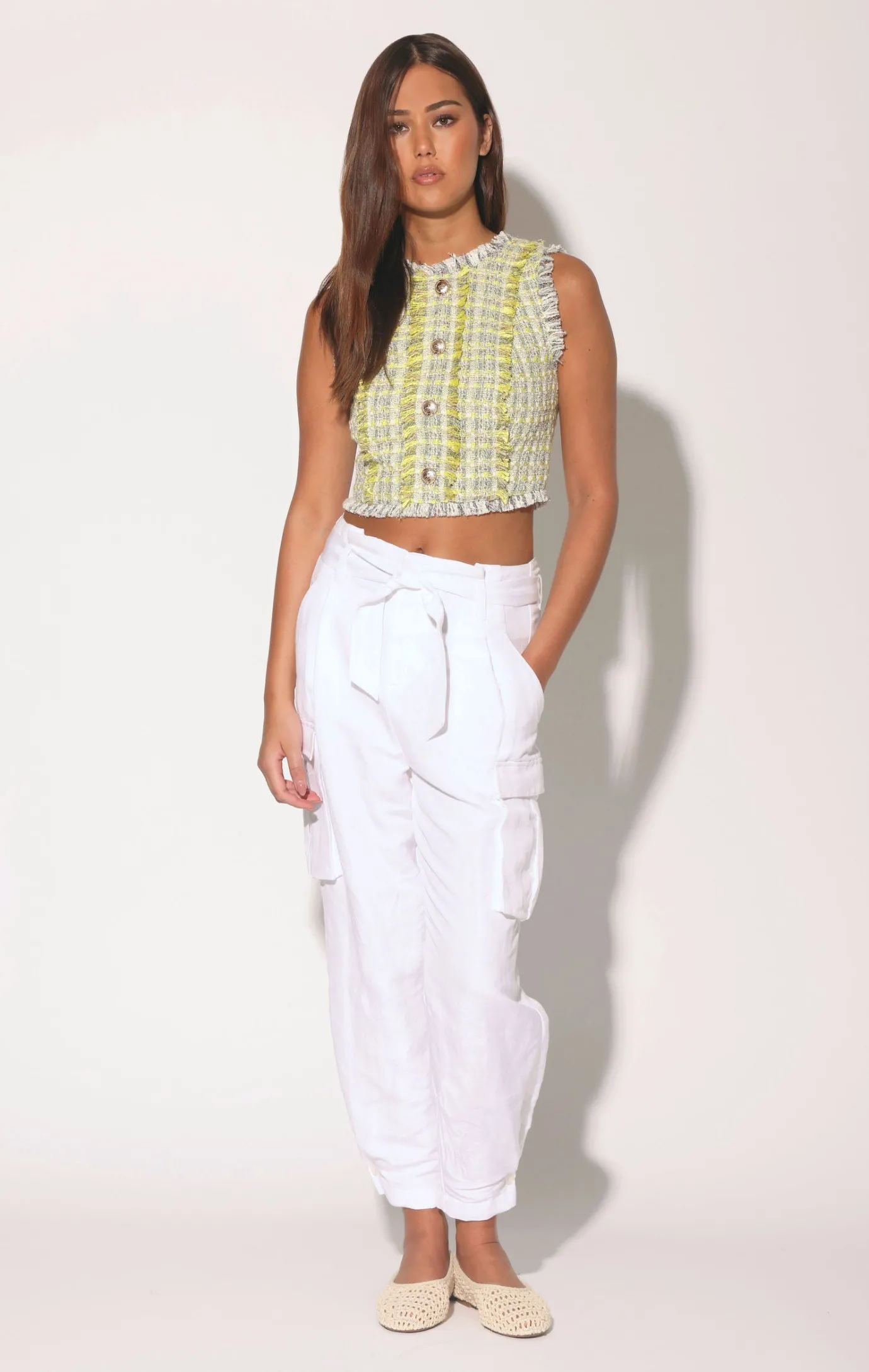 A crop top in our chic tweed fabric, the Dara Top features gold engraved button and luxe fringe accents. Wear it with the Dalia Skirt for a set look.