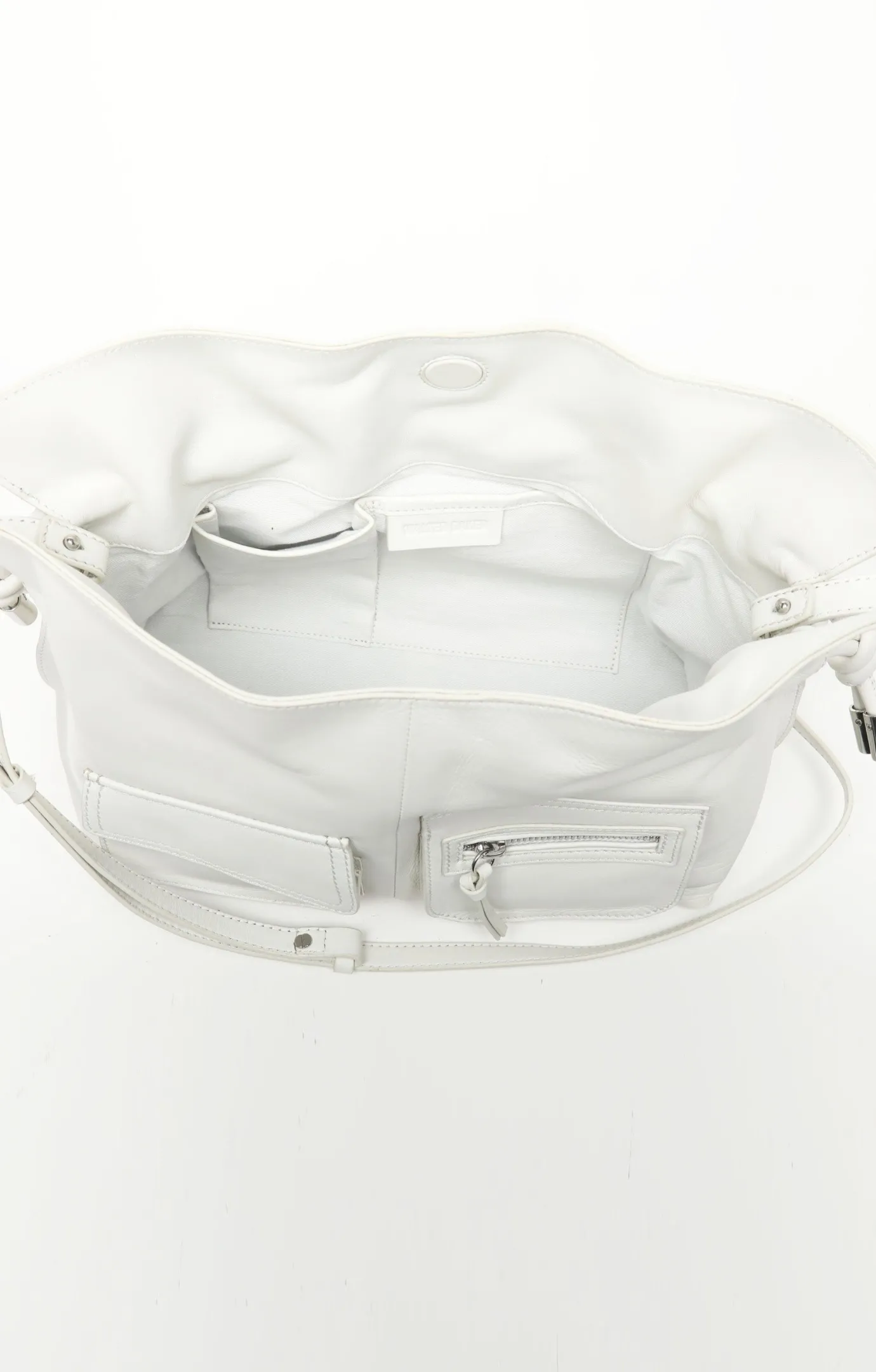Magnet top closure; Soft tubular knotted details with metal accents; Interior slip pockets with debossed logo; Fully lined; Comes with dust bag