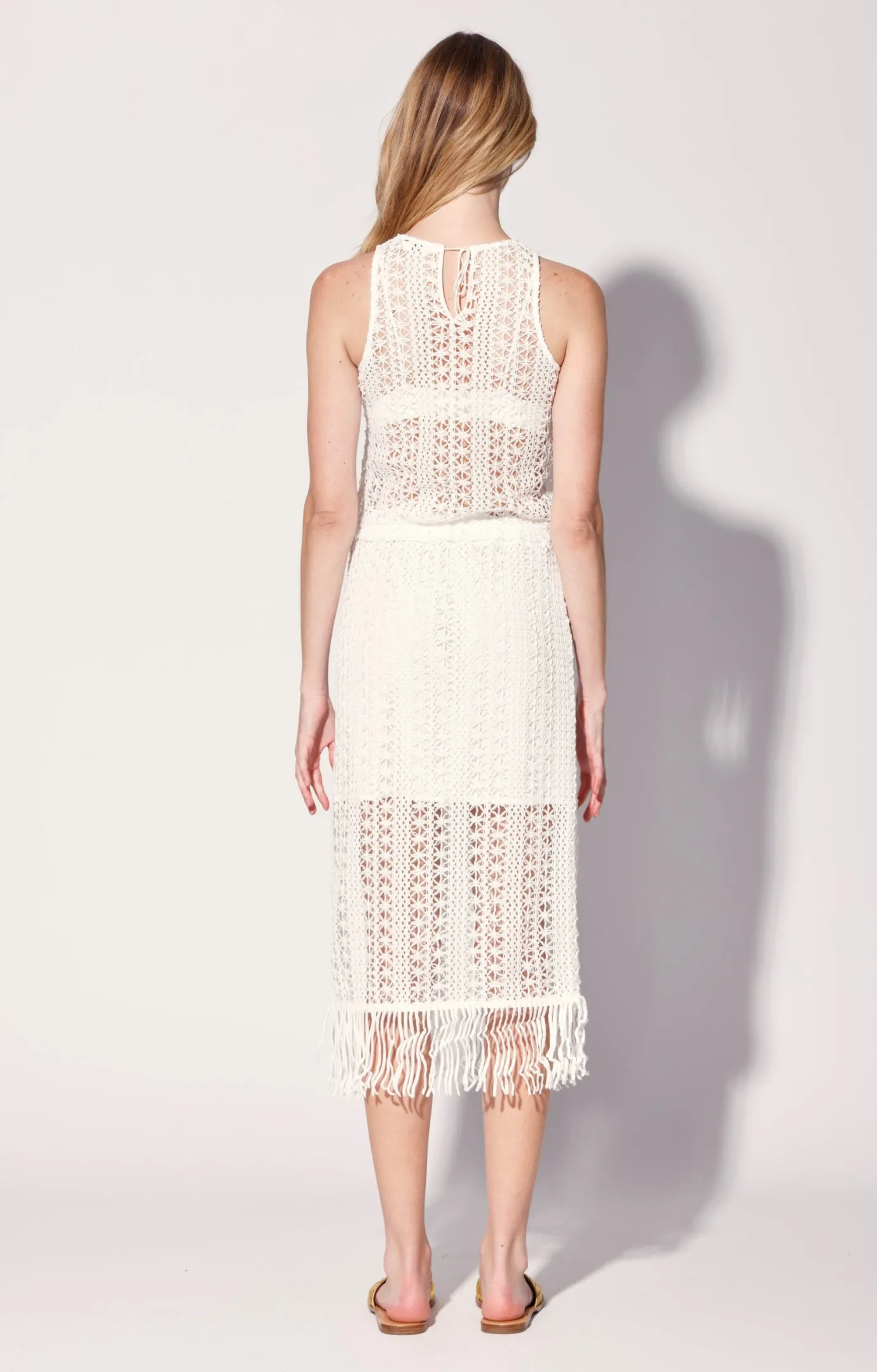 The Ivanna Skirt is a cool column shape in our intriguing crochet fabric. This midi length look with fringe accent is even more stylish when worn with the Izzy Top