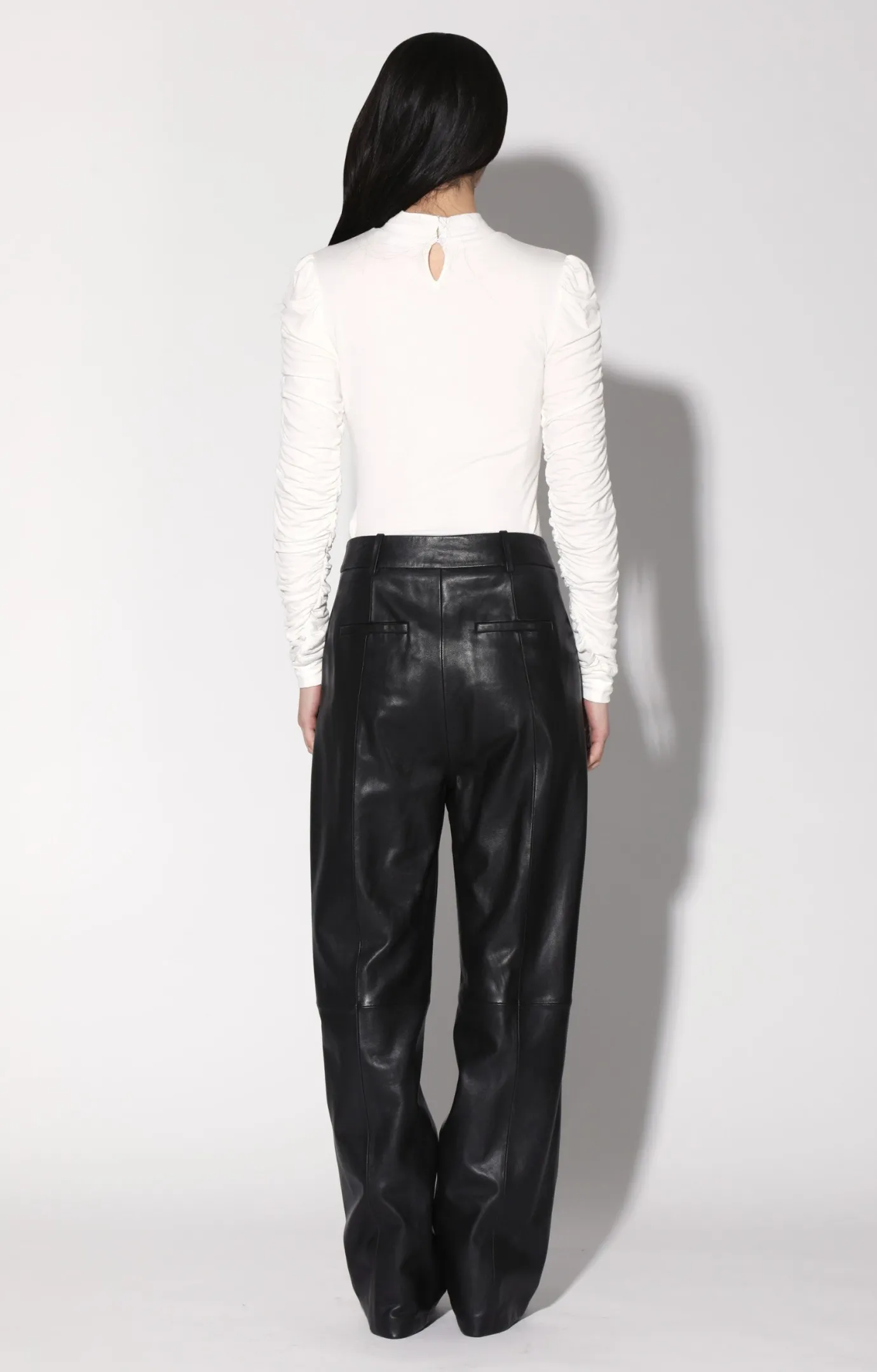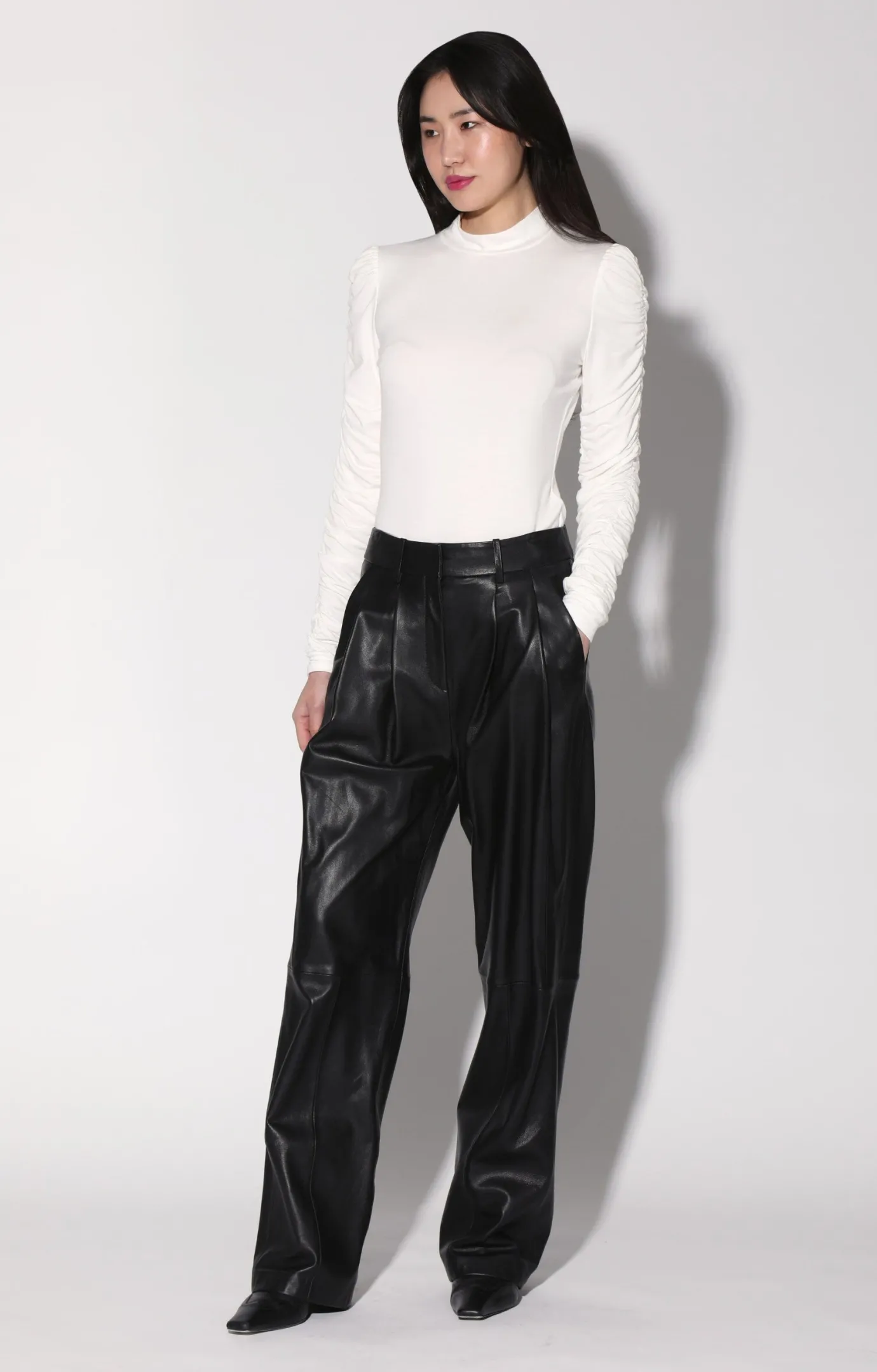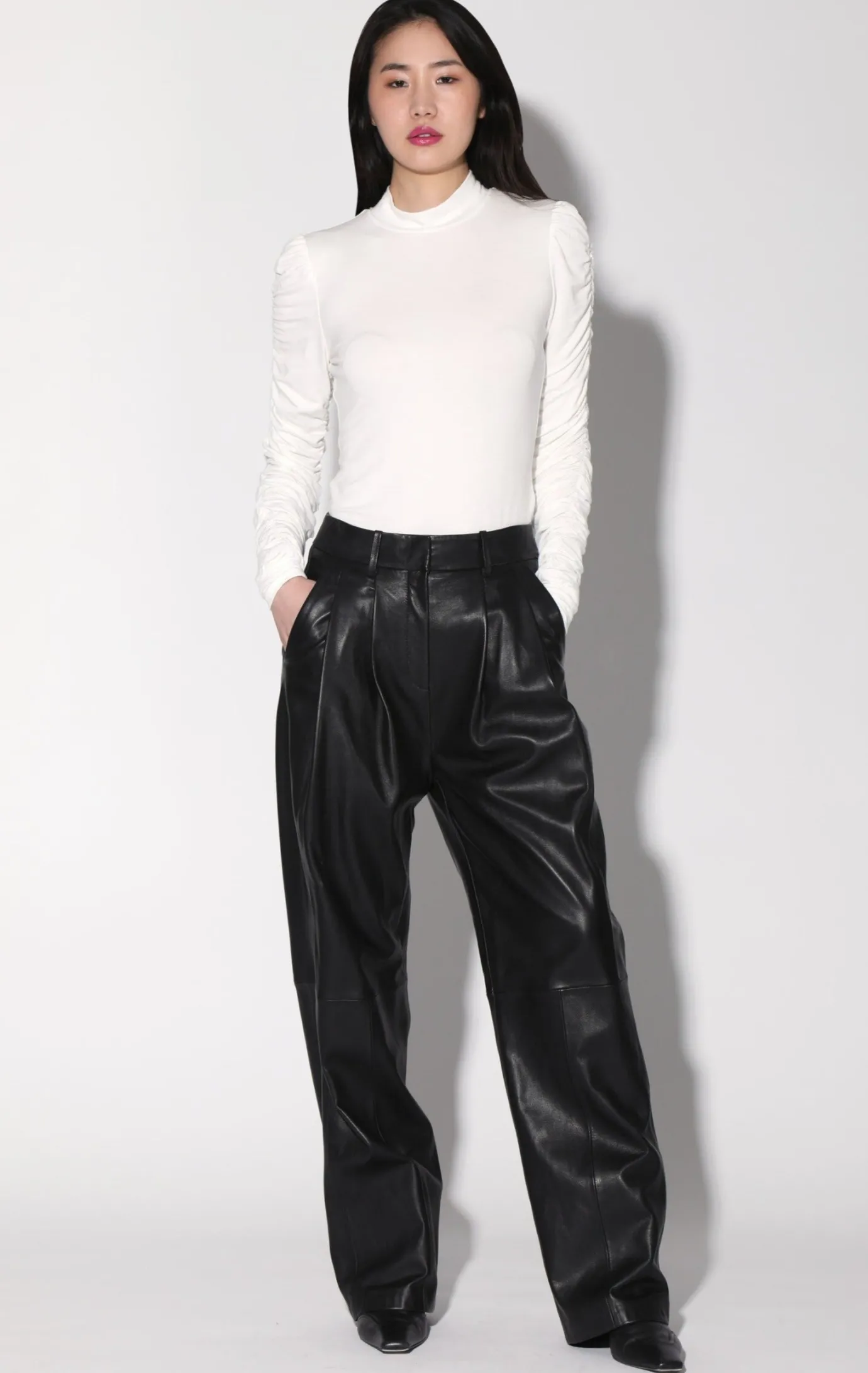 The Luka Pant is a leather meets suiting must have. It features a slouchy low waist fit, pleat details, and wide legs