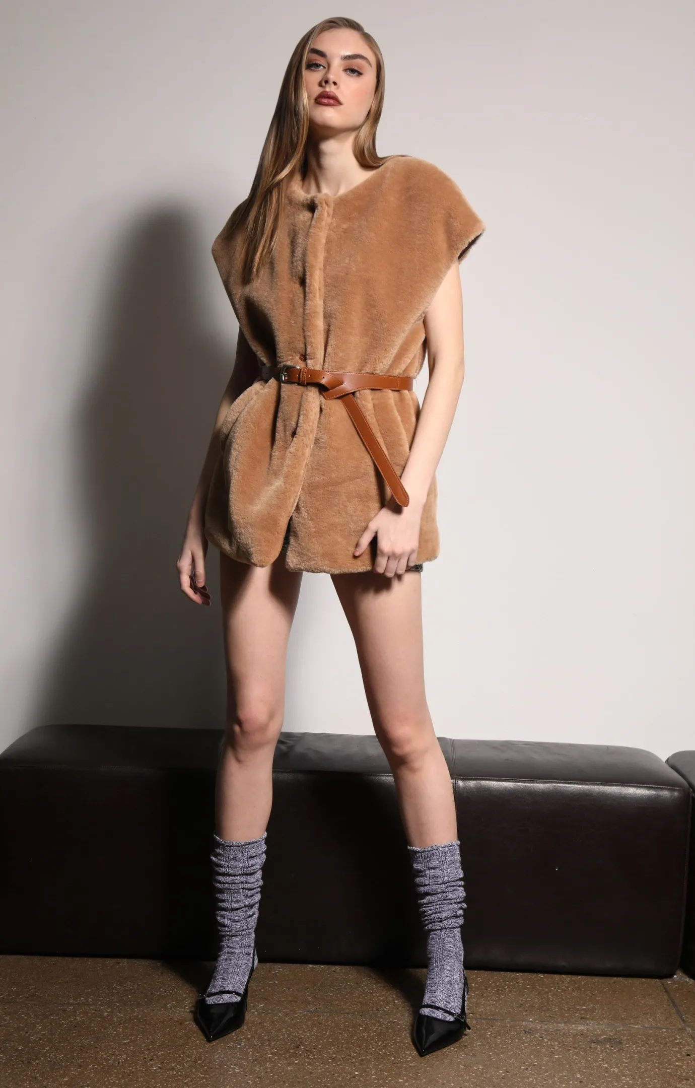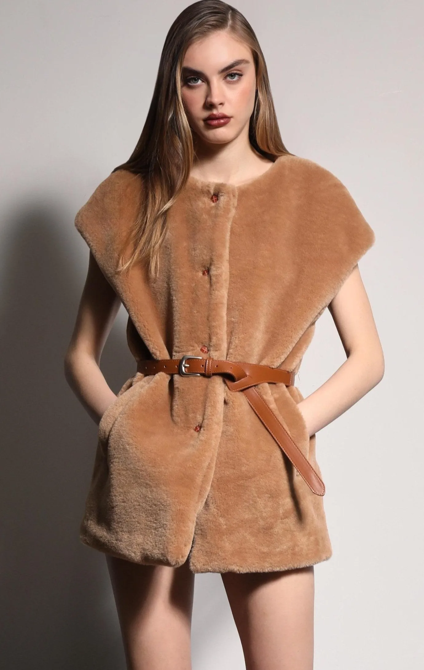 The Maryanne Vest is an elegant faux fur look. With a belted waist and side pockets, you’ll want to wear it over everything